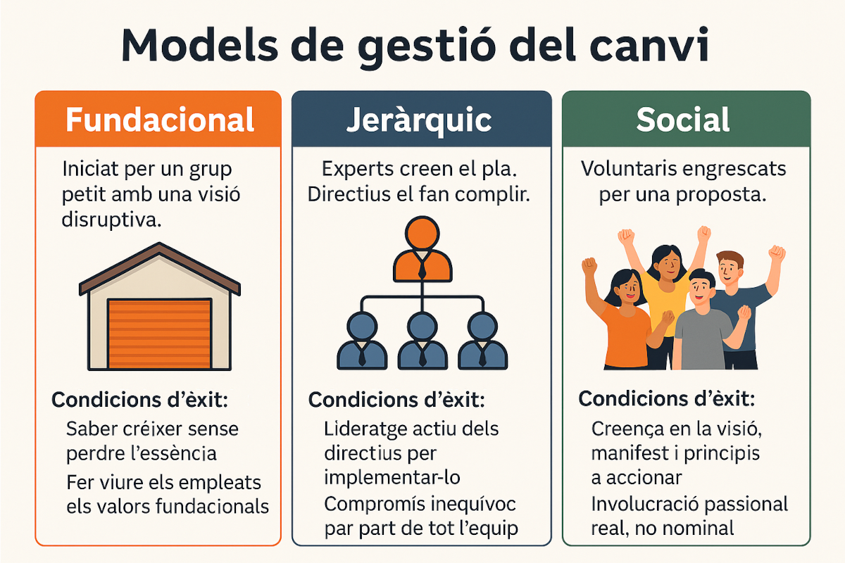 Disculpeu que aquesta resposta sigui una mica densa. Intentaré que les properes no ho siguin, però crec que cal explicar bé com funcionen els projectes de gestió del canvi. Hi ha tres models: fundacional, jeràrquic o social: